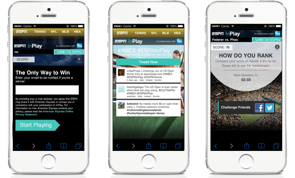 HighlightsBuilt utilizing HTML5 and responsive web design to produce a fully functional backend, the app was equipped with a customized CMS to enable real-time product updates during broadcast times. This allowed for a rich experience, where the user was able to interact with predictive and historical trivia questions as well as utilize Twitter and Facebook to see what others were saying about the match. The user could also instantly jump into a conversation and tweet a response or comment to their Facebook wall.